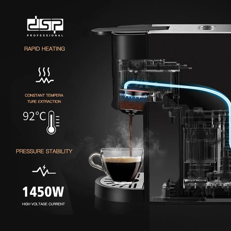 تتيح لك ماكينة القهوة متعددة الكبسولات DSP، 19 بار 1450 وات، تحضير قهوتك بسهولة في أقصر وقت ممكن مع ماكينة القهوة المميزة هذه، سهلة الاستخدام ونظيفة. مجهزة بشكل احترافي لتستمتع بقهوة لذيذة لا تقاوم دون إحداث أي فوضى في المكان.