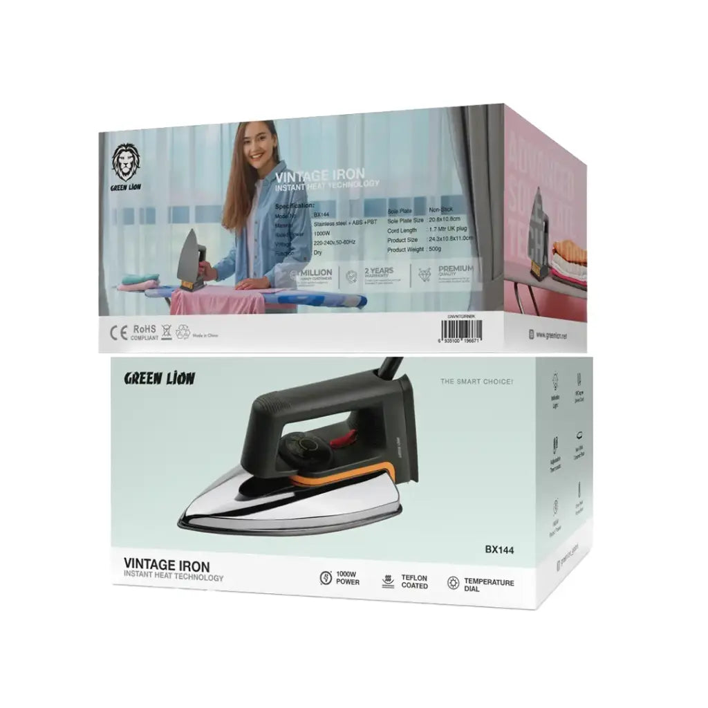 Green Lion Vintage Iron 1000W is a powerful, stylish iron that offers efficient and easy ironing. It is constructed from durable stainless steel, ABS, and PBT materials and performs efficiently. Equipped with its 1000W rated power and voltage range of 220-240V, 50-60Hz, the iron gives consistent heat for quick and efficient use. The 20.8x10.8cm non-stick ceramic soleplate glides effortlessly across the fabric without any damage and produces a flawless finish. An adjustable thermostat with a temperature dial maintains accurate heat for various fabrics. Safety is ensured by an auto-off mechanism, overheat protection, and a Teflon-coated soleplate. The 180-degree swivel cord and 1.7m UK plug are easy and convenient, and the indicator light reminds you of the state of the iron. Perfect for homes today, the Green Lion Vintage Iron is all about functionality, safety, and retro style.